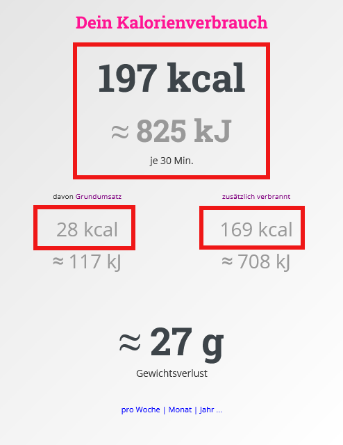 Wenn du im Fitrechner den Kalorienumsatz einer Tätigkeit berechnest bekommst du drei Angaben zum Kalorienverbrauch während der angegebenen Zeitspanne: